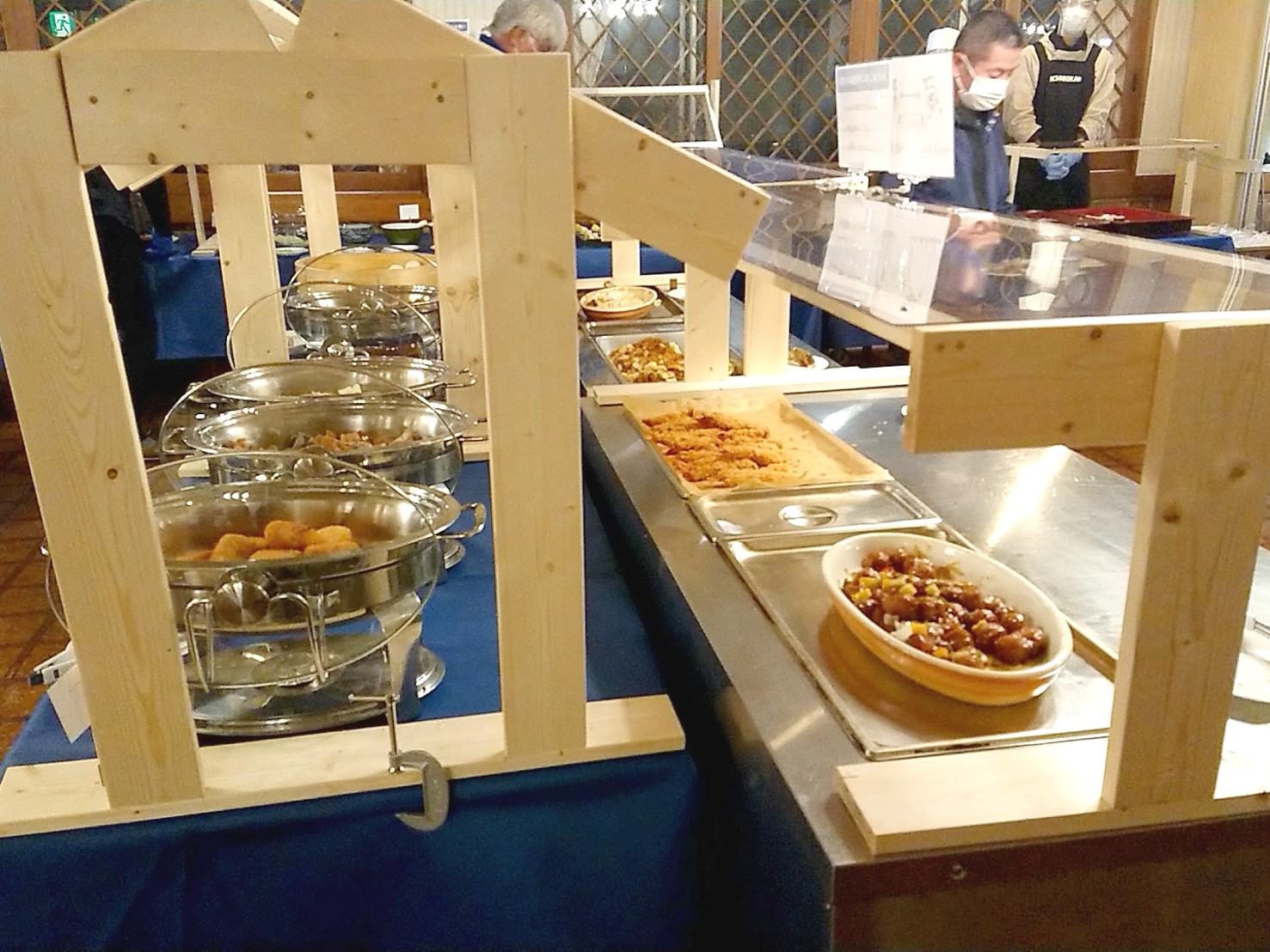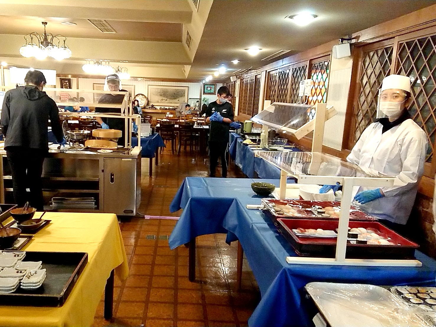 ブッフェコーナーには、飛沫防止パネルを設置し、スタッフはマスク、フェイスシールド、手袋を着用しております。