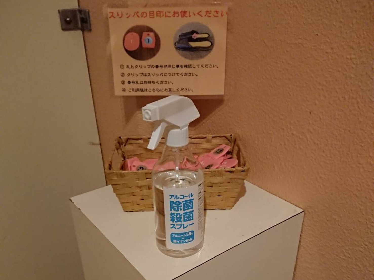 脱衣場の入り口にアルコール除菌スプレーを設置しております。
